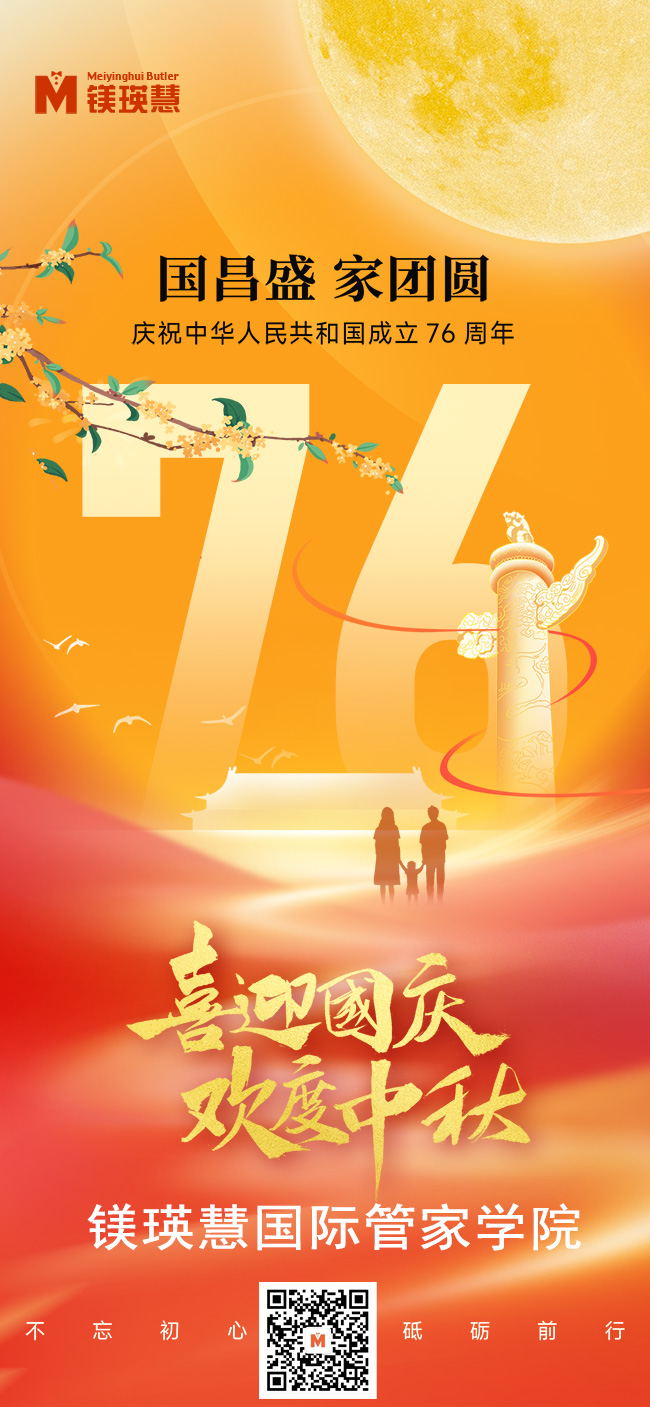 金風(fēng)送爽,丹桂飄香,一輪明月的清輝映照著神州大地的璀璨燈火。當(dāng)國慶的榮光與中秋的溫情美好相遇,我們共同沉浸于家國同慶、四海共圓的喜悅之中。在這雙節(jié)同輝的美好時(shí)刻,鎂瑛慧國際管家學(xué)院與您一同感受國家的繁榮與家庭的溫暖,并謹(jǐn)以此文,向這份獨(dú)特的“中國式圓滿”致以最深的敬意。
